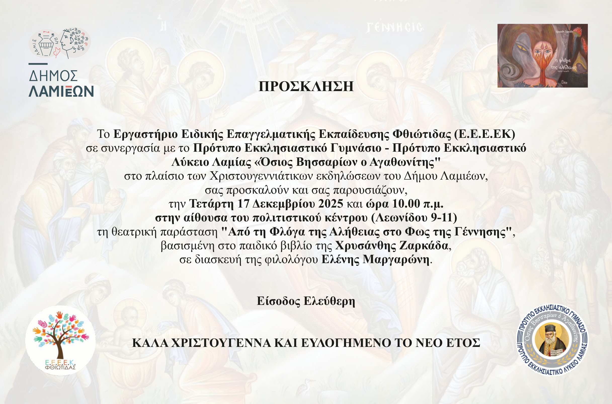 Το Εργαστήριο Ειδικής Επαγγελματικής Εκπαίδευσης (Ε.Ε.Ε.ΕΚ.) Φθιώτιδας σε συνεργασία με το Πρότυπο Εκκλησιαστικό Γυμνάσιο – Πρότυπο Εκκλησιαστικό Λύκειο Λαμίας «Όσιος Βησσαρίων ο Αγαθωνίτης» στα πλαίσια των εορταστικών εκδηλώσεων για τα Χριστούγεννα, υπό την αιγίδα του Δήμου Λαμιέων παρουσίασε την θεατρική παράσταση «Από την Φλόγα της Αλήθειας στο Φως της Γέννησης», ζωντανεύοντας στα μάτια των θεατών τις αρχές της συμπεριληπτικής εκπαίδευσης, θεμελιωμένης σε πνεύμα ομαδοσυνεργαστικότητας, αποδοχής και σεβασμού. Η παράσταση βασίστηκε στο παραμύθι της κ. Ζαρκάδα Χρυσάνθης σε διασκευή της Φιλολόγου κ. Μαργαρώνη Ελένης.